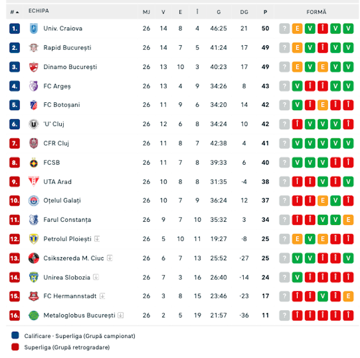 Clasament SuperLiga după 26 de etape